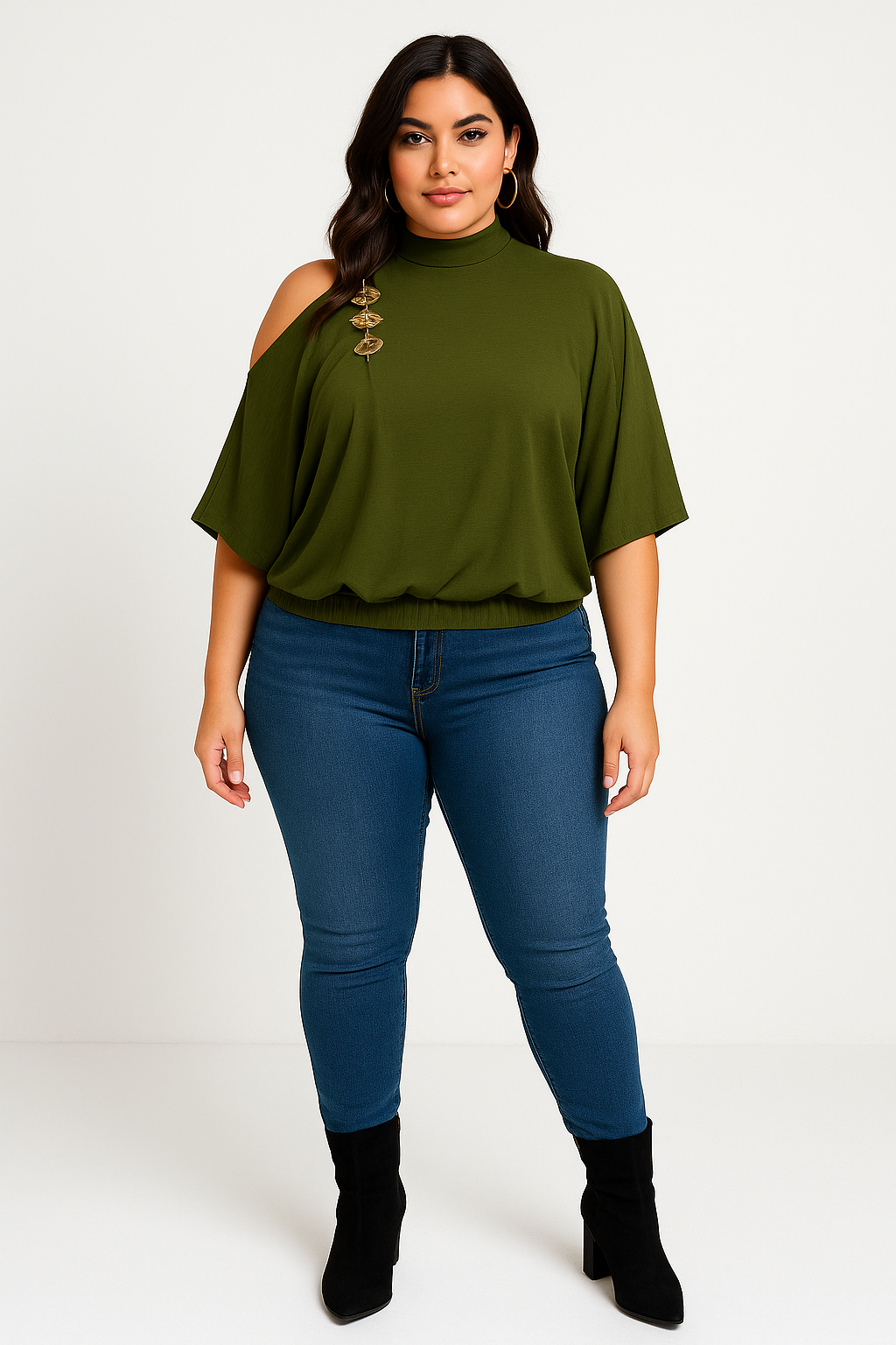 Elevate your style with the Royale Shoulder Drape Top, a chic blend of modern elegance and effortless sophistication. Designed with a luxe one-shoulder drape and a high neckline, this piece makes a bold yet refined statement. The sculpted gold embellishments highlight the exposed shoulder, adding a touch of glam that sets this top apart.
