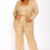 Shine from every angle in this stunning 3-piece metallic sequin-like set, complete with a matching blazer, crop top, and wide-leg pants. Designed with padded shoulders for a bold, structured silhouette, the blazer features button trim detailing with no closure for a sleek, open-front look.