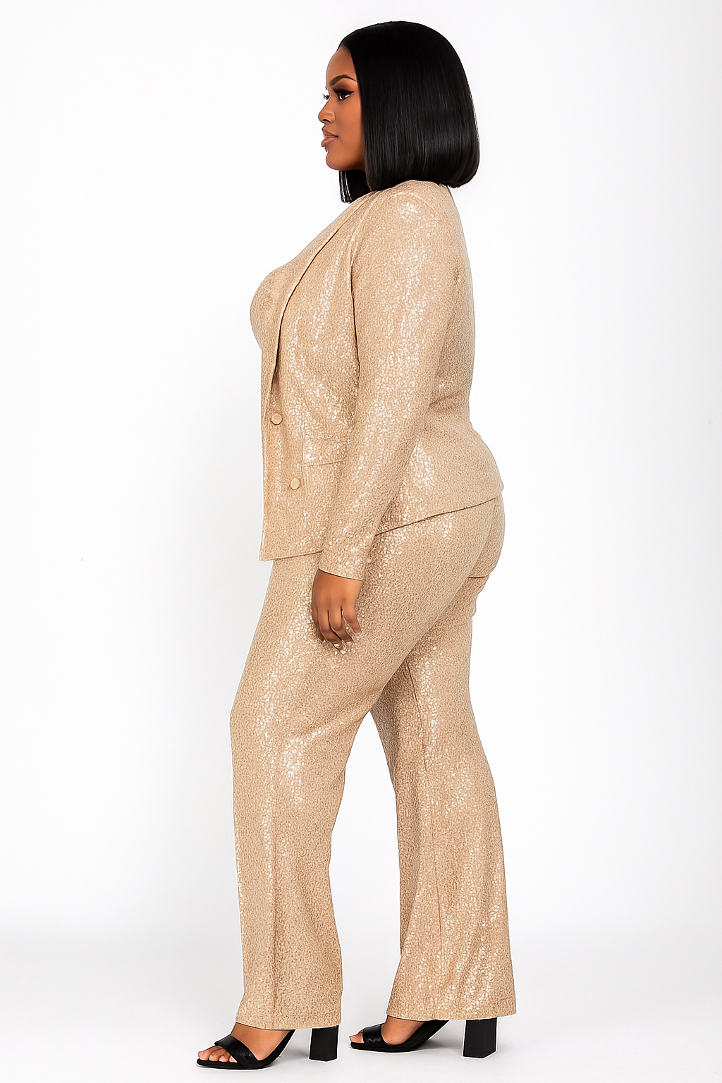 The matching crop top pairs perfectly with the ultra-flattering wide-leg pants, made with an elastic waistband and premium stretch fabric for a comfortable, curve-enhancing fit. This set moves beautifully, catches the light effortlessly, and delivers head-turning glamour for any event.