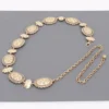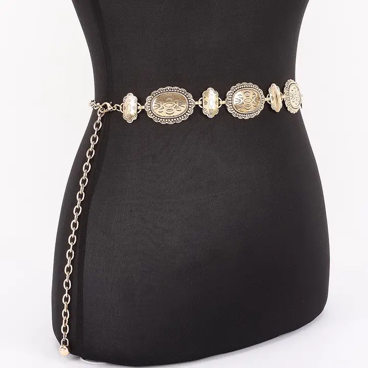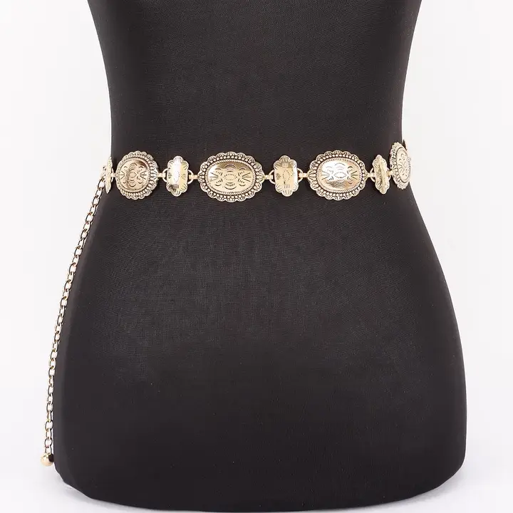 Add a touch of timeless charm to any outfit with our Golden Echo Concho Belt. This vintage-inspired waist chain features beautifully engraved medallion links with antique detailing that elevates your silhouette with effortless chic. Designed with an adjustable chain for the perfect fit, this statement belt pairs flawlessly with dresses, jumpsuits, denim, and oversized tops. Lightweight, elegant, and boldly feminine—this piece brings a touch of Western glam and boutique sophistication to your wardrobe.