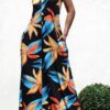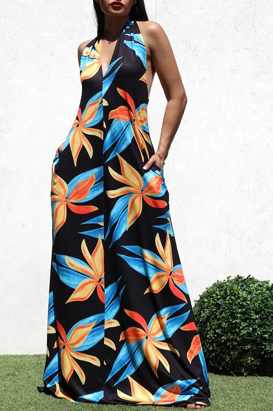 Turn up the tropical heat in the Island Blaze Halter Maxi, a statement-making dress designed to transport you straight to paradise. This eye-catching piece features a bold halter neckline and a plunging V-cut that flatters the décolletage while offering breezy sophistication. The dress flows into a relaxed, floor-sweeping silhouette adorned with oversized, fiery floral prints in electric blue, sunset orange, and golden yellow — all set against a deep black backdrop for high contrast drama. Designed with side pockets for a touch of effortless cool and comfort, this dress is perfect for beachside cocktails, tropical getaways, or summer festivals. Lightweight, flowy, and full of vibrant energy, it’s a must-have for any warm-weather wardrobe craving a bold splash of island flair.
