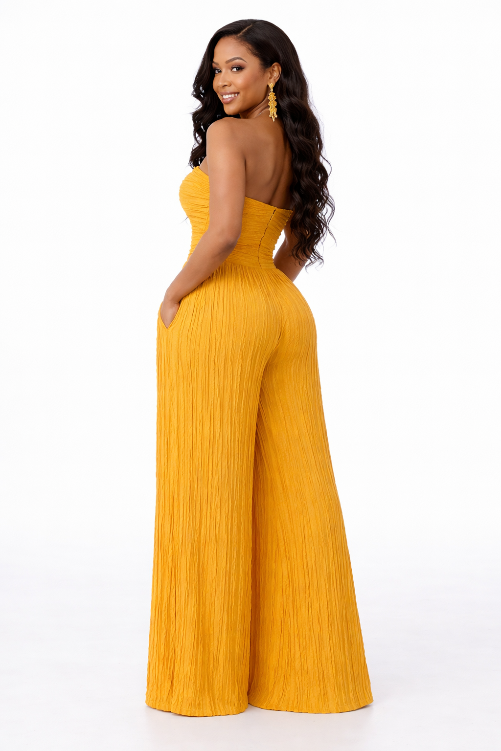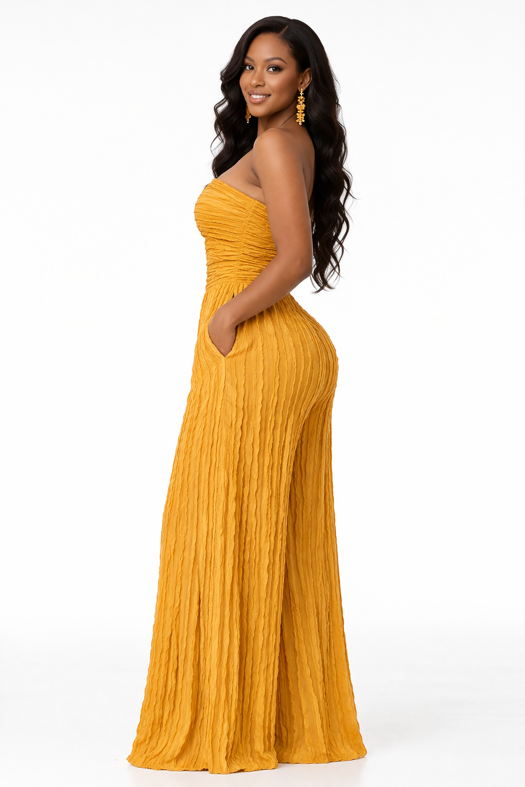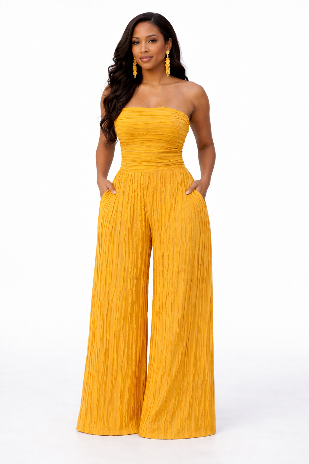 Step into effortless elegance with the Ivy Allure Textured Jumpsuit — where softness meets statement. Designed with a flattering strapless neckline, this piece features a delicate ruffle-textured fabric that adds dimension and movement with every step. The cinched bodice hugs your curves beautifully, while the wide-leg silhouette flows with a luxe, airy finish.