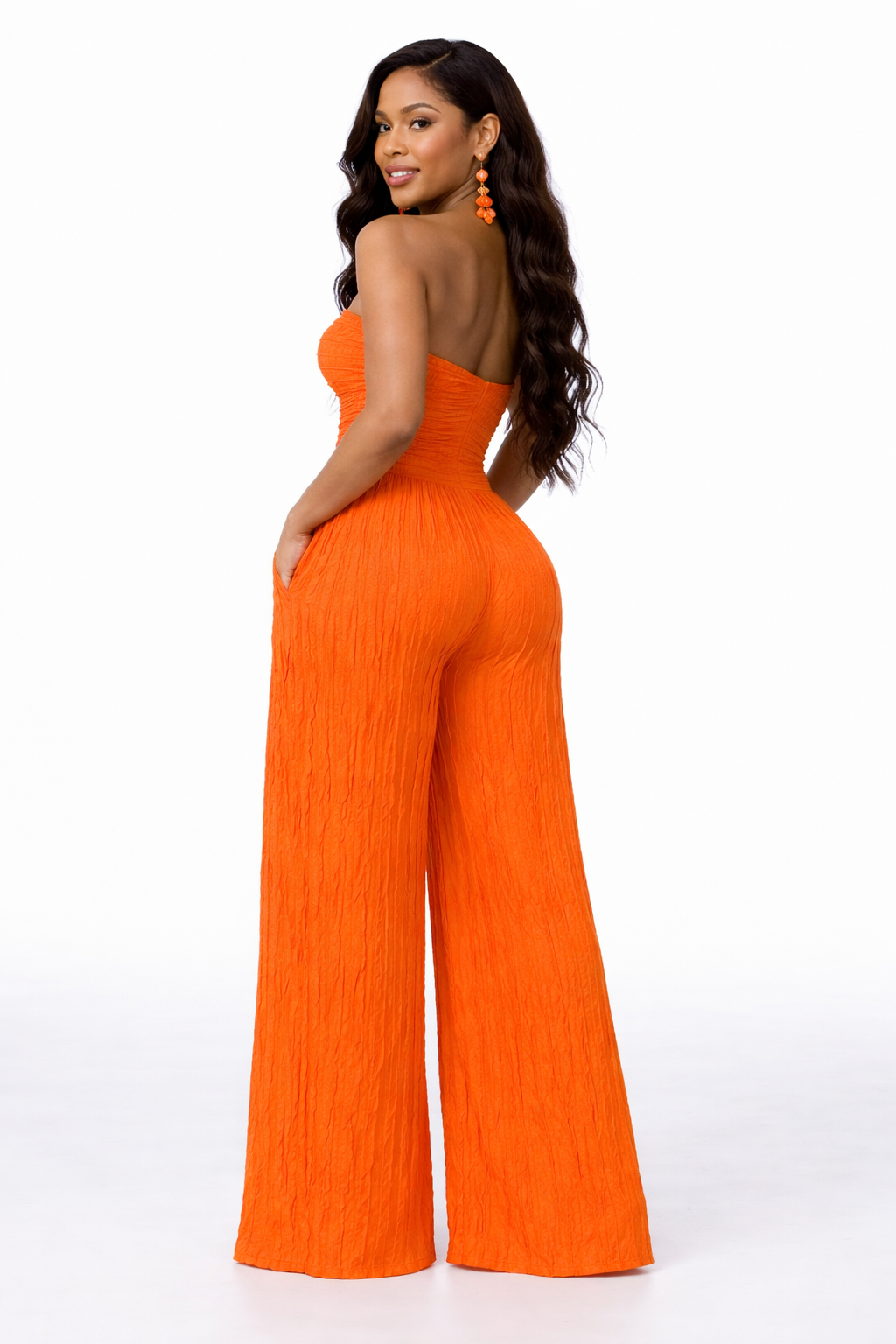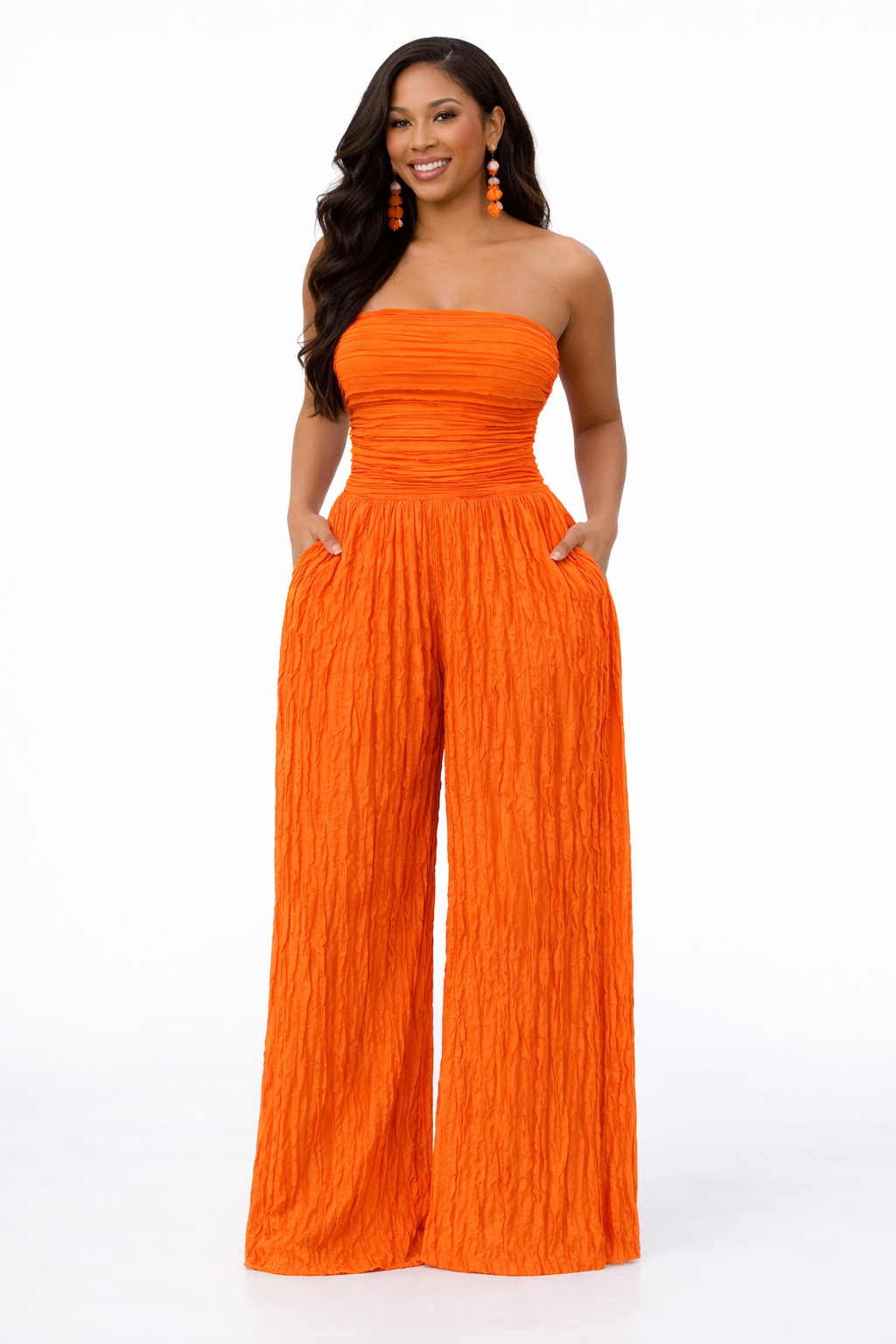 Step into effortless elegance with the Ivy Allure Textured Jumpsuit — where softness meets statement. Designed with a flattering strapless neckline, this piece features a delicate ruffle-textured fabric that adds dimension and movement with every step. The cinched bodice hugs your curves beautifully, while the wide-leg silhouette flows with a luxe, airy finish.