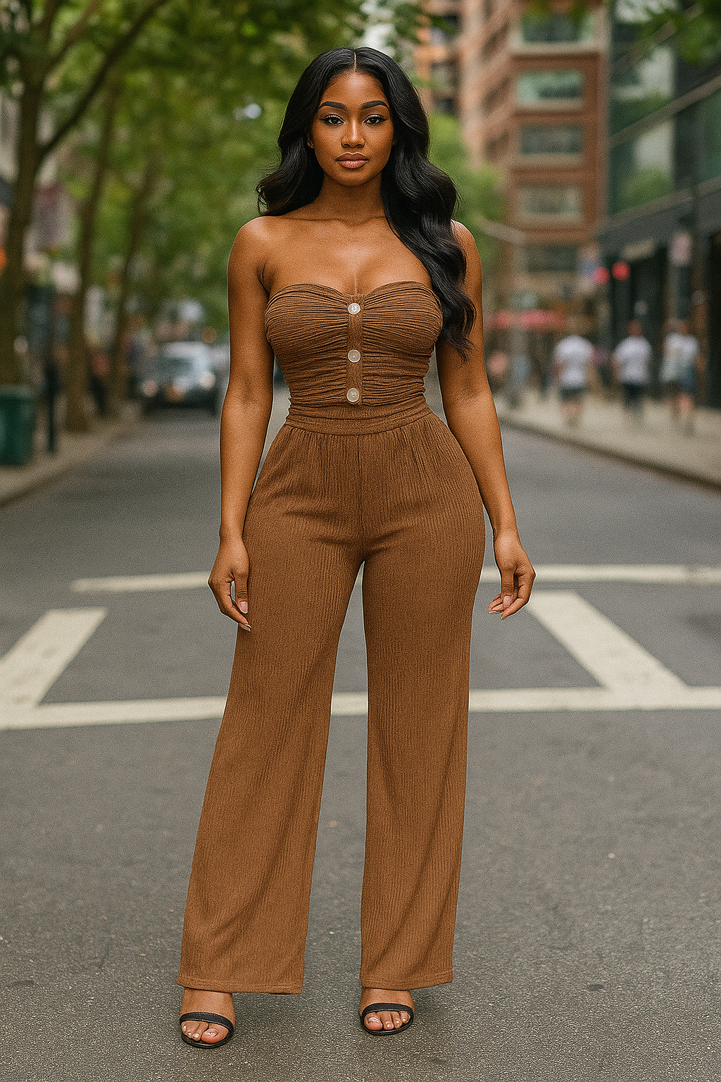 Turn heads in our Luxe Pleat Power Set, the perfect blend of sophistication and effortless style. This two-piece features a strapless ruched top with statement buttons down the front, designed to accentuate your curves while keeping it chic. The matching wide-leg pleated pants flow with every step, giving you an elegant yet relaxed vibe. Whether you’re dressing it up with heels for a night out or keeping it sleek for brunch with the girls, this set is a wardrobe essential.