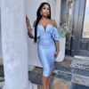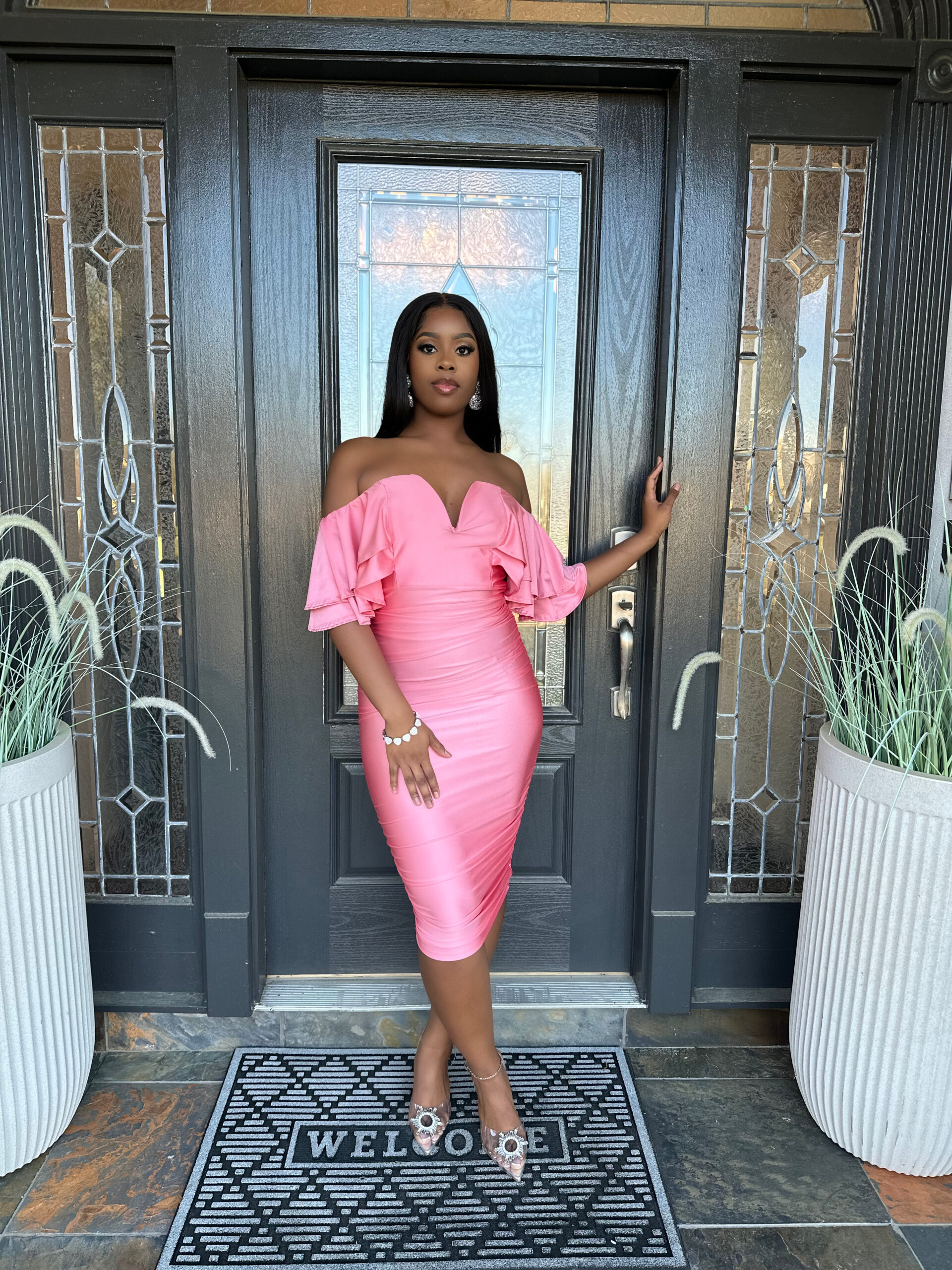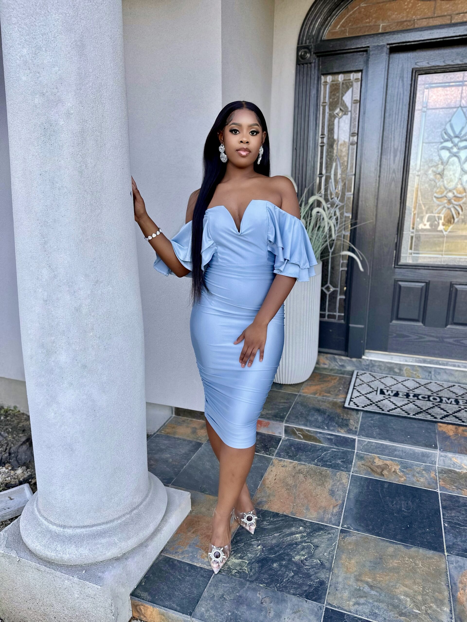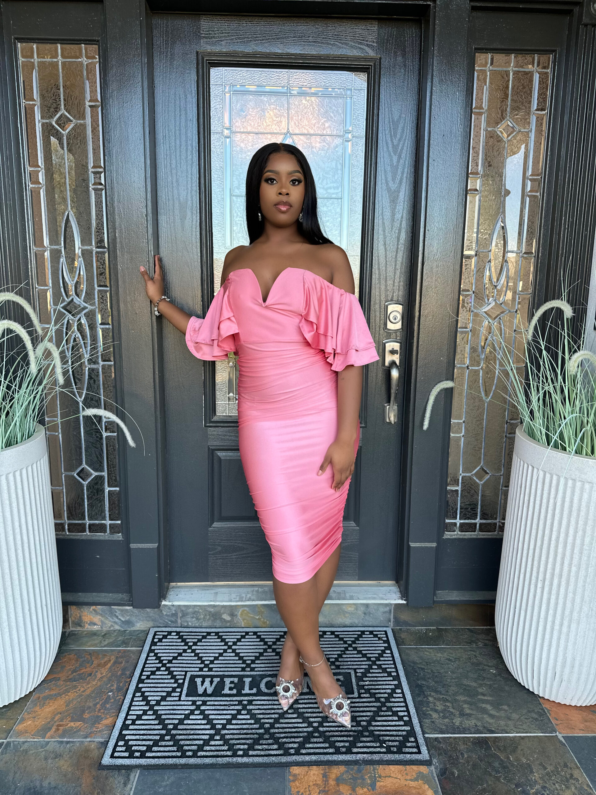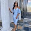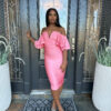 This off the shoulder, draped midi dress is amazing.