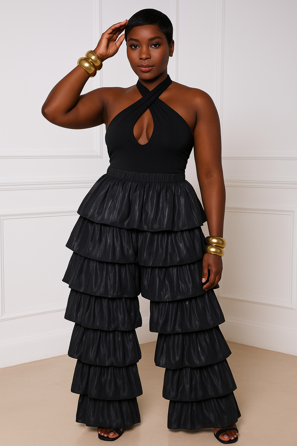 Make a bold statement in the Pearl Cascade Palazzo Pants — a high-waisted showstopper crafted from a shimmering, pleated fabric that catches the light with every step. Designed with dramatic, tiered ruffles from hip to hem, these pants give off a voluminous, flowing silhouette reminiscent of a modern goddess. The soft champagne hue elevates the glamour, while the exaggerated structure adds runway-level drama. Perfect for fashion-forward occasions or luxe resort evenings. Pair with a minimal top or a statement piece for a head-turning look.