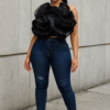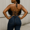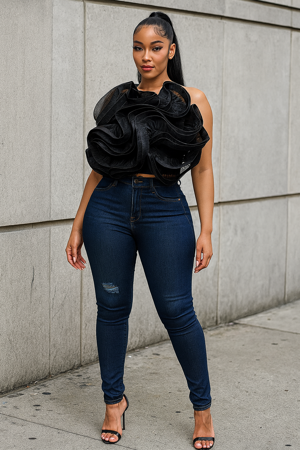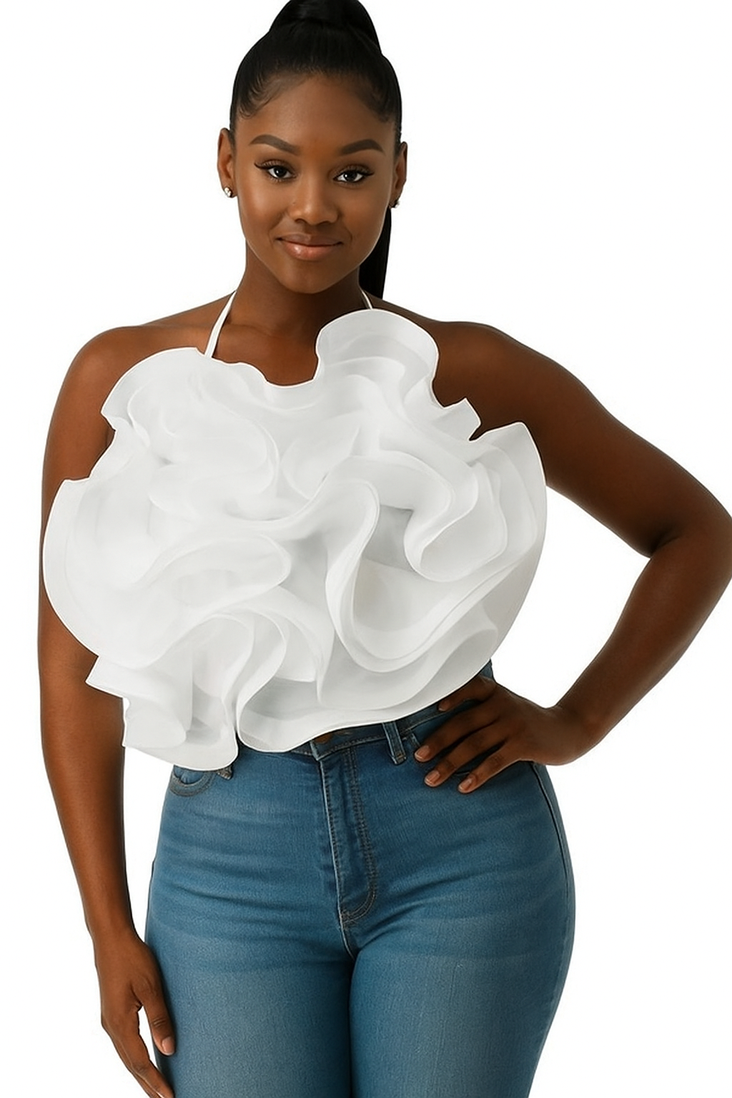 Make a bold statement in the Rosé Bloom Halter Top, featuring dramatic 3D ruffles and a flirty lace-up back. Available in black and white, it’s the perfect mix of elegance and edge for any night out.