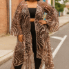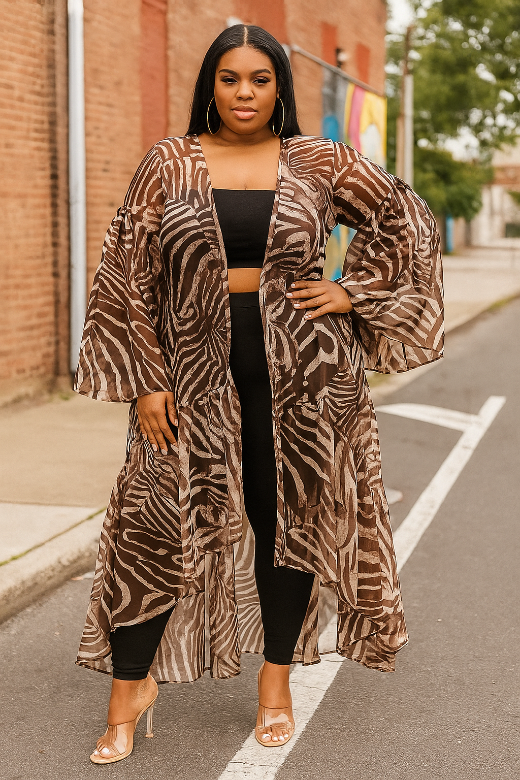 Unleash your wild side with the Savanna Flow Duster, a sheer, flowy cardigan that drapes effortlessly with every step. Featuring a bold zebra-inspired print in rich earth tones, this lightweight layer adds instant drama and sophistication to any outfit. The voluminous bell sleeves and cascading hem create a breezy silhouette perfect for turning heads at brunch, the beach, or a night out. Whether worn over a crop top and leggings or a swimsuit, this statement piece brings elevated safari-chic vibes to your wardrobe.