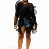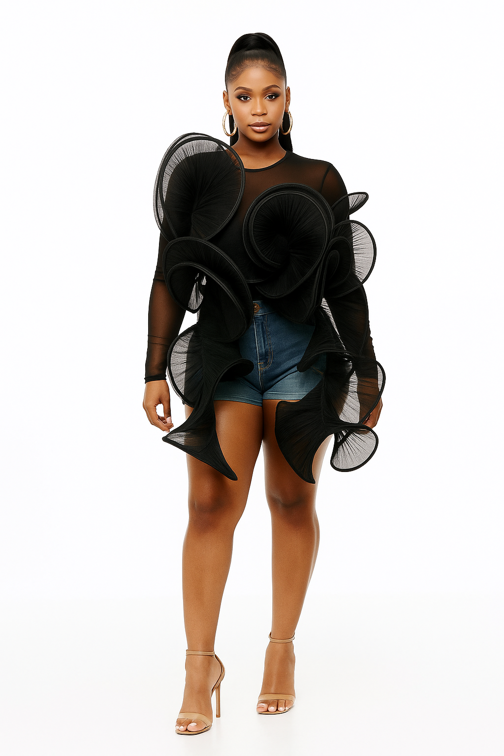 Turn every entrance into a statement with the Sculpted Bloom Mesh Top. This bold, fashion-forward piece features sheer black mesh paired with dramatic 3D organza ruffles that cascade in sculptural waves across the front and sides. The fitted silhouette balances the avant-garde design, creating the perfect blend of art and attitude. Pair it with denim, heels, or sleek trousers for a head-turning look that defines modern luxury.
