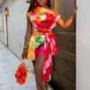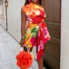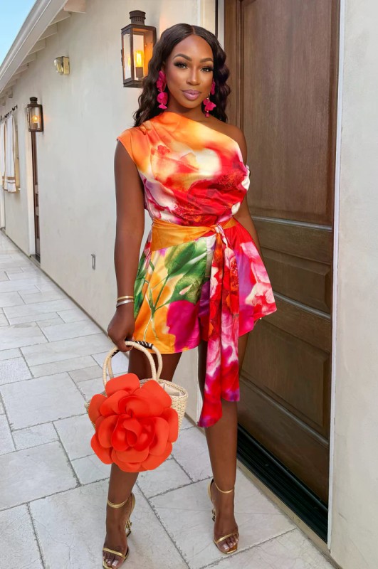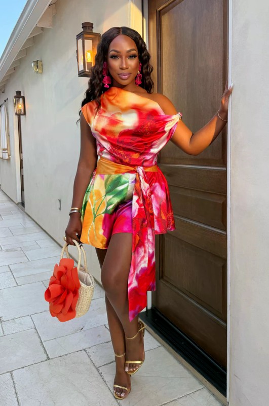 Radiate tropical goddess energy in the Sunset Bloom Romper, a one-shoulder stunner that captures the vivid beauty of a summer sunset in full floral bloom. This luxurious satin-like romper features a watercolor-inspired floral print with bold splashes of orange, fuchsia, red, and violet, giving off instant vacation vibes. The asymmetrical neckline with soft draping adds a touch of drama, while the cinched waist is accentuated with a matching sash tie that flatters your figure and adds effortless elegance. Whether you’re sipping cocktails seaside or stealing the spotlight at a summer soirée, this romper is your go-to for vibrant glam with a flirtatious twist.