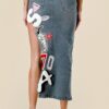 Bring bold energy to your look with the Varsity Edge Denim Skirt. This high-waisted, asymmetrical midi skirt features a daring thigh-high slit and an edgy raw hem. Eye-catching varsity-style patches in vibrant colors add a playful, sporty vibe to the classic denim silhouette. Whether paired with heels or sneakers, this skirt is perfect for making a statement while keeping it effortlessly cool.